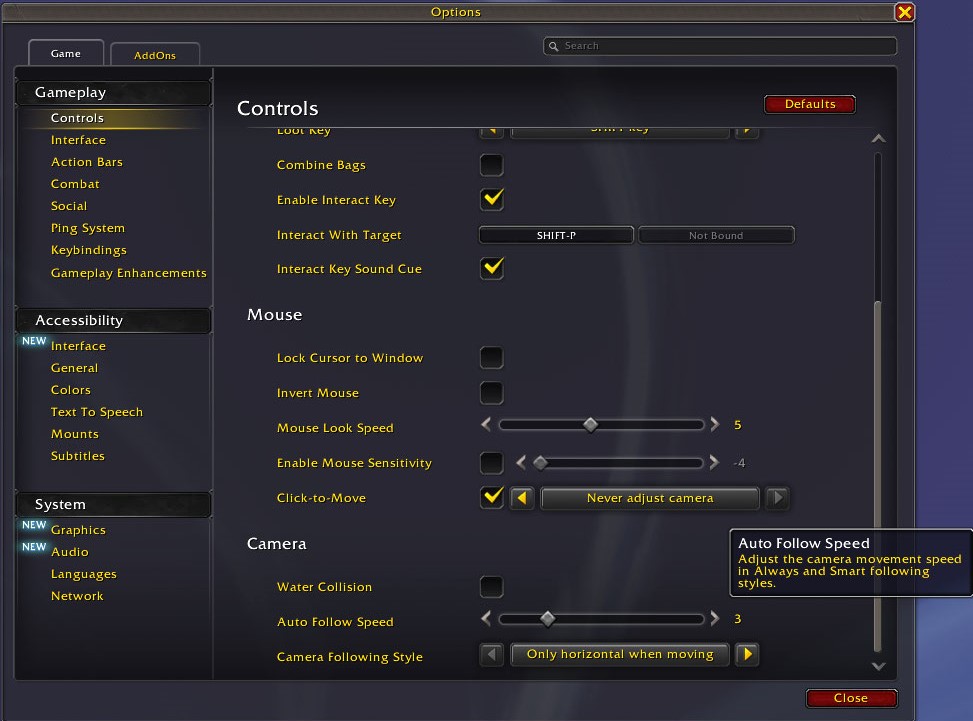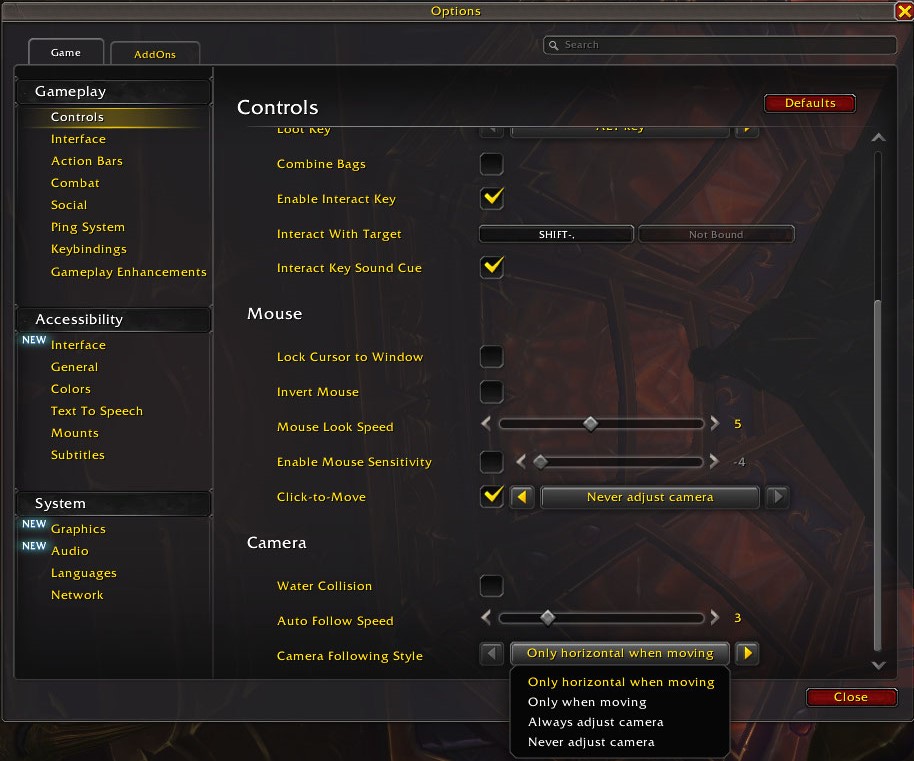In the interface section under Options → Gameplay → Controls, there are settings related to camera behavior. The best configuration depends on your playstyle whether you prefer using the keyboard (more buttons) or the mouse (more clicks). In this guide, I will focus on a setup that emphasizes keyboard usage.