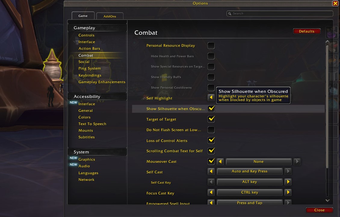 This option enables a silhouette of your character to appear when they are obscured by objects in the game environment. It’s especially useful in areas with scattered obstacles, helping you maintain visibility of your character. To activate this feature, go to: Options → Gameplay → Combat, and enable the setting.